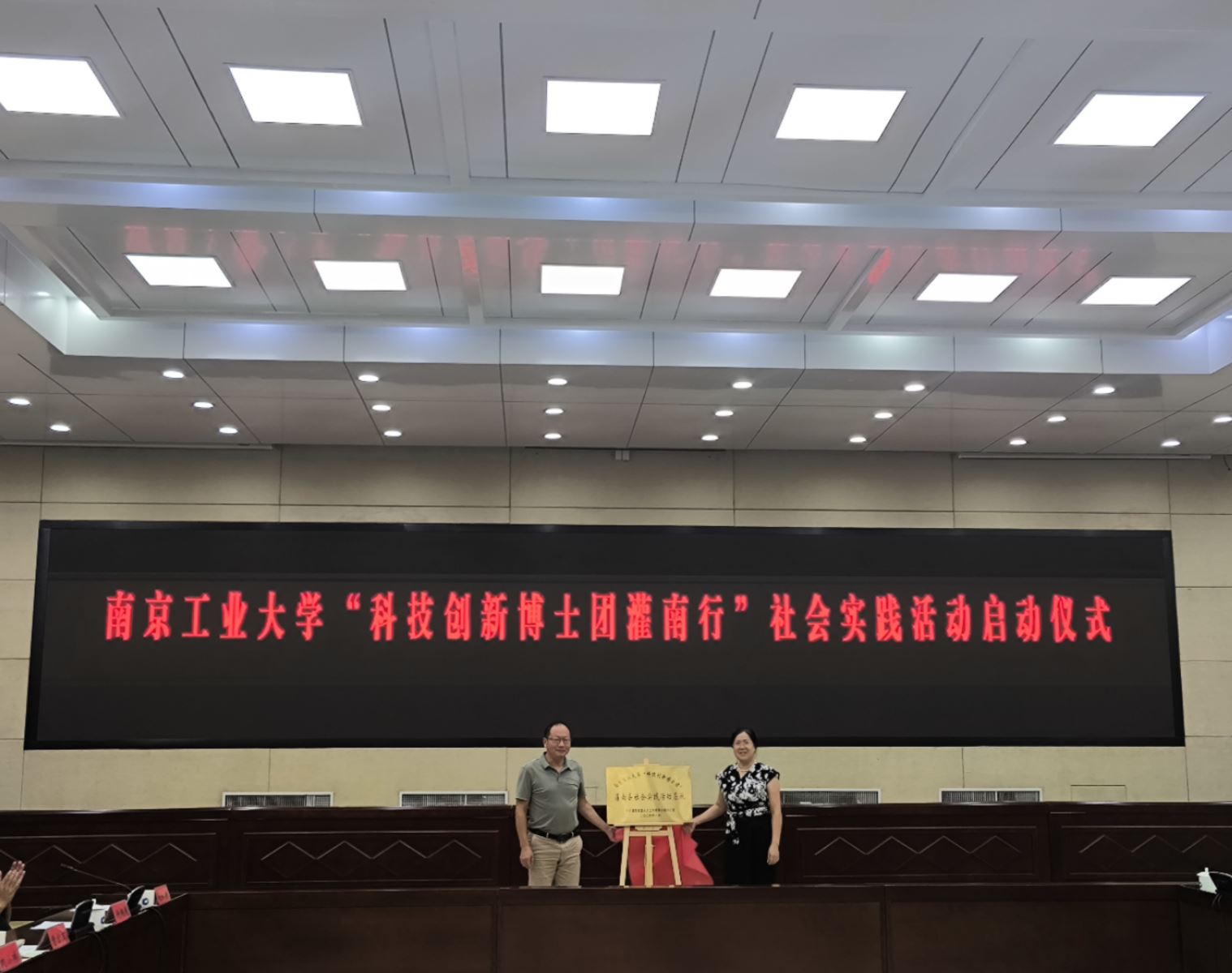 启动仪式上,与会人员观看了灌南县宣传片;县政协副主席、科技局局长韦丹丹和校党委研究生工作部副部长、研究生院副院长高洁分别致辞;中共灌南县委组织部副部长张竹祥宣讲灌南县人才政策;实习生代表与企业代表作交流发言;最后南工大教授、绿化研究院有限公司董事长崔咪芬与市科技局副局长徐奔月为南京工业大学“科技创新博士团“灌南县社会实践活动基地揭牌。