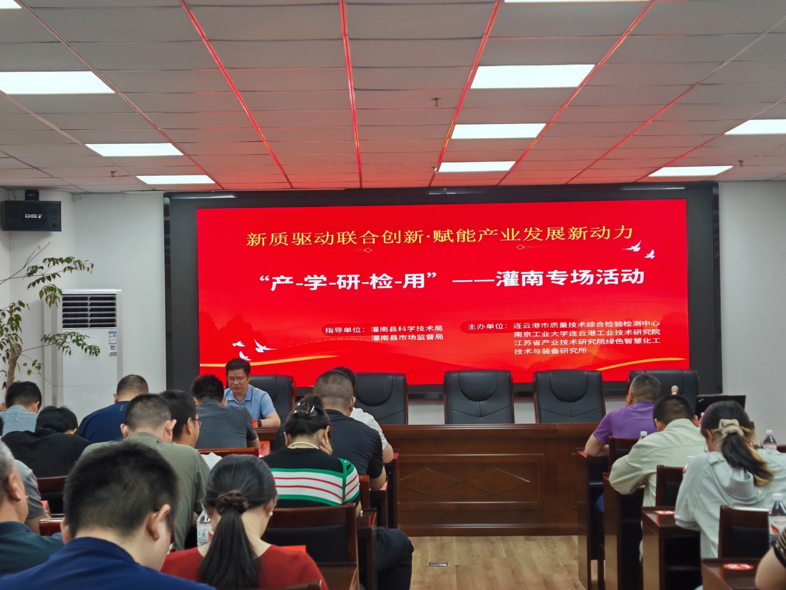 为进一步推动产业升级,服务产业链高质量创新发展,构建“产、学、研、检、用”五位一体科技创新体系,推进相关企业、高校、科研院所、检测机构开展深入合作,由灌南县科学技术局、灌南县市场监督局联合指导,连云港市质量技术综合检验检测中心、南京工业大学连云港工业技术研究院、江苏省产业技术研究院绿色智慧化工技术与装备研究所主办的以“矢志联合创新•赋能产业发展”为主题的“产-学-研-检-用”灌南专场活动于6月26日上午成功举行。灌南县科学技术局副局长严朝明、灌南县市场监督局副局长孙益平、连云港市质量技术综合检验检测中心主任陈进、南工大连云港研究院常务副院长兼江苏省产业技术研究院绿色智慧化工技术与装备研究所副所长刘小祥、市质检中心各专业室负责人/技术专家、南工大连云港研究院及绿色智慧化工技术与装备研究所相关部门负责人、灌南县相关领域重点企业代表、灌南县有关负责同志和相关媒体代表等出席本次活动。活动参加人员约40人,其中灌南县化工、轻工包装、建材、食品等重点行业企业代表30余人。